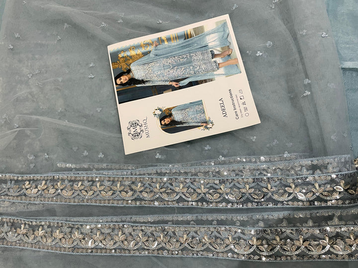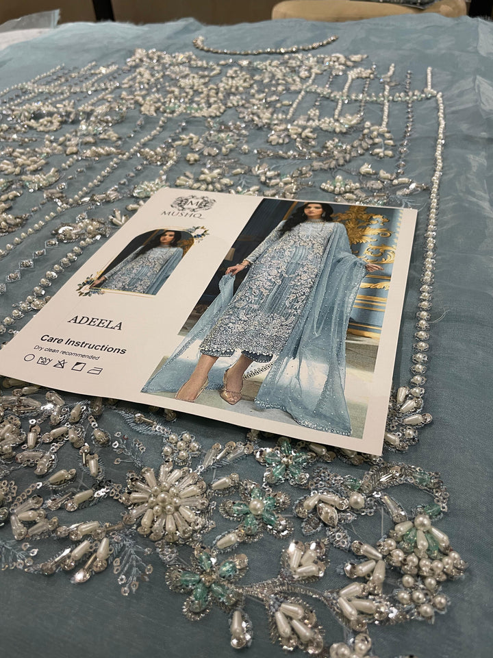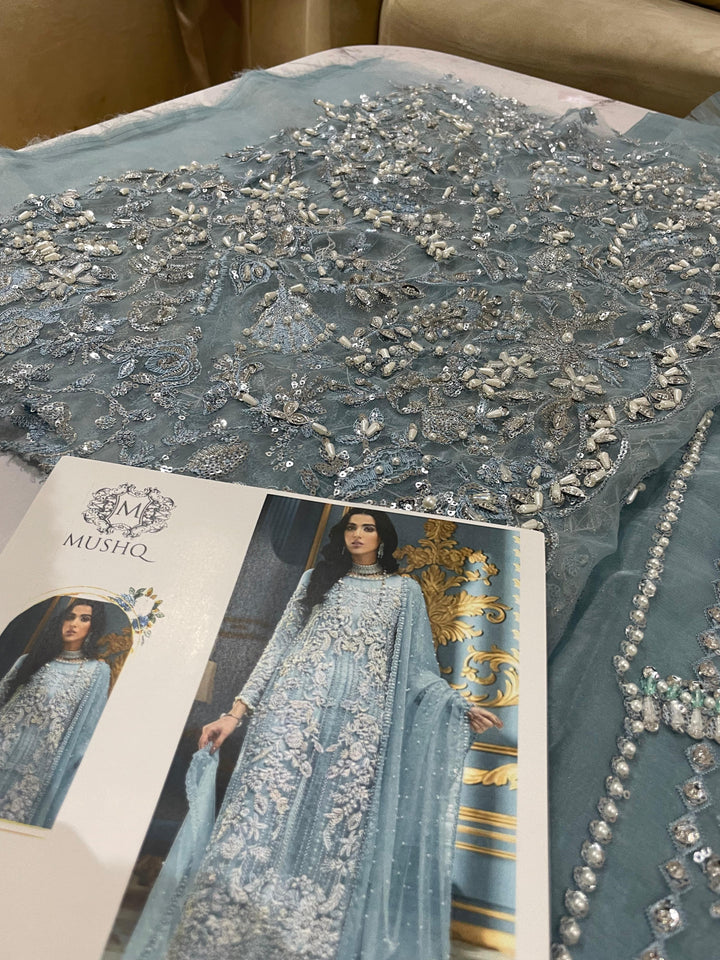 This Olive shade long shirt crafted from pure silk organza is heavily ornamented with Crystal's and thread work. This luxurious outfit is finished and a pearl embellished dupatta for an ethereal look.