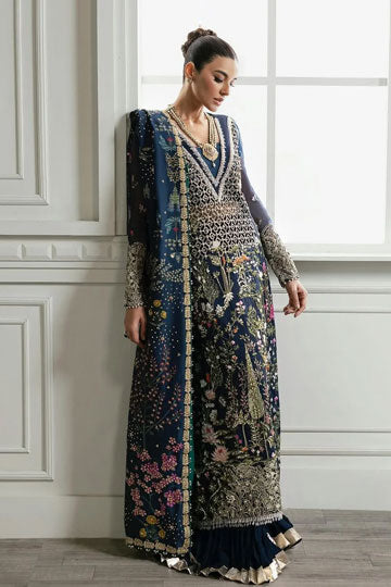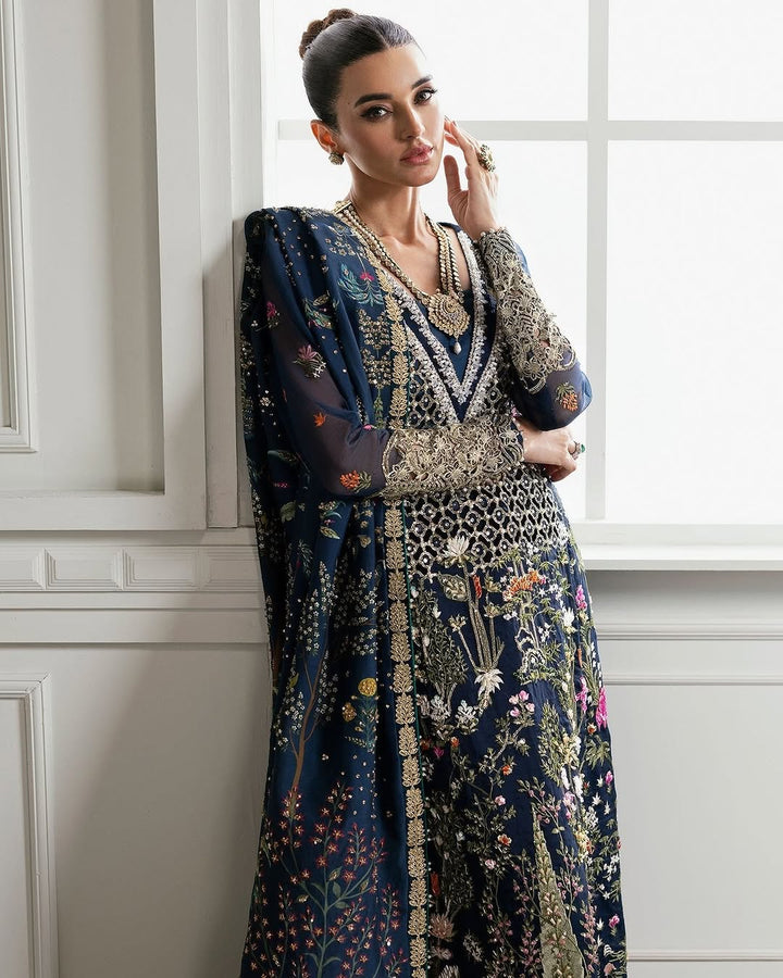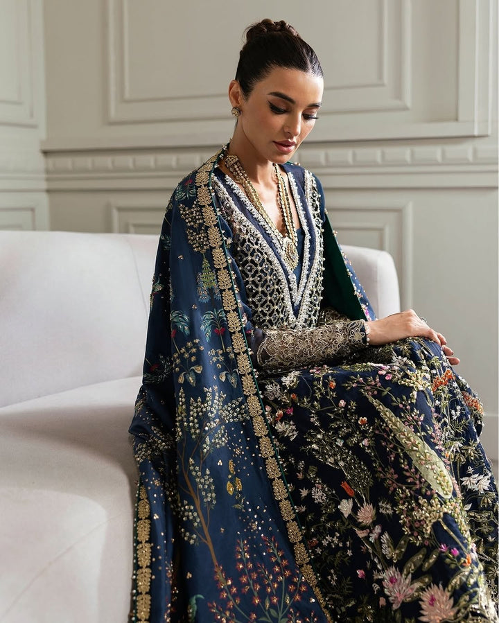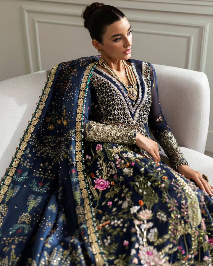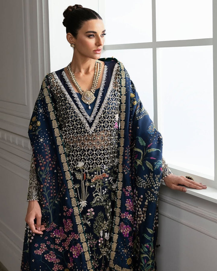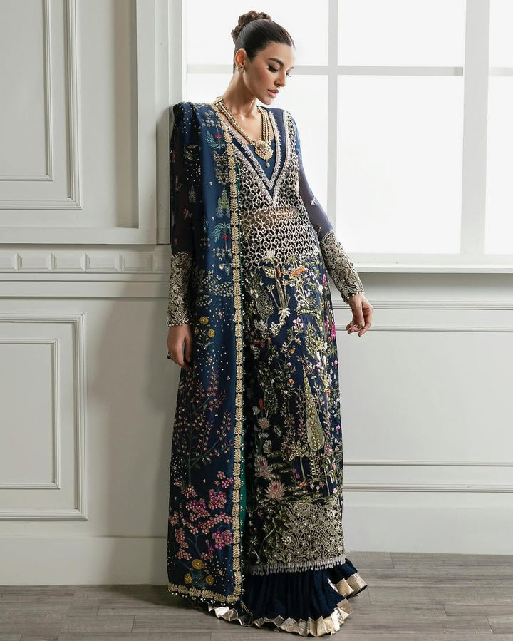 The shirt hem will be finished with double silver crystal hangings 1cm apart. 2. Hand Embellished shawl will be finished with an emerald green lining, the tilla border provided and 4 hanging tassels from corners. No tasseling along sides. 3. Sequined and ghaara embroidered sleeves will be attached. 4. Flair mentioned for crushed sharara is when stretched. 5. Sharara will be finished with a golden gota border of 2 inches. 5. Side slits and sleeves will be finished with single pearls 0.5 inches apart.