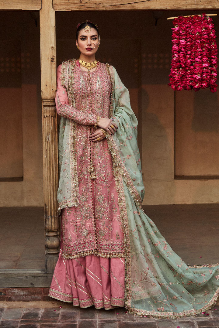 - Trouser: The outfit is paired with a Korean embroidered raw silk sharara, adding a unique and refined charm to the overall look.