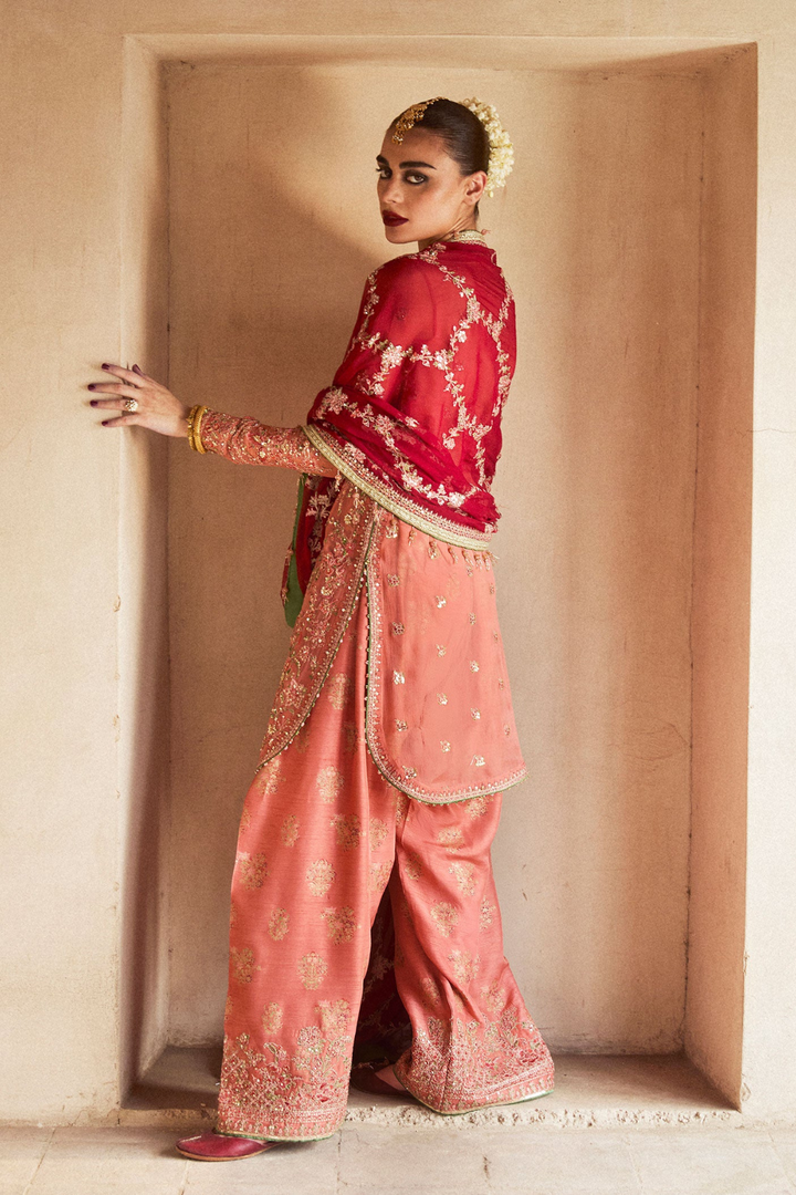 The look is completed with an intricately embroidered chiffon dupatta, featuring a unique jaal design and four-sided borders for a refined finish. This attire is the perfect fusion of sophistication and cultural aesthetics.
