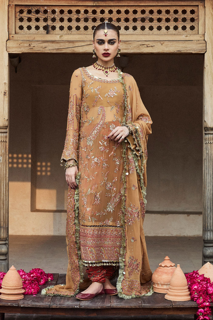 The luxurious chiffon dupatta, adorned with embroidered floral bunches and four-sided scalloped borders, completes the outfit with a strikingly beautiful finish.