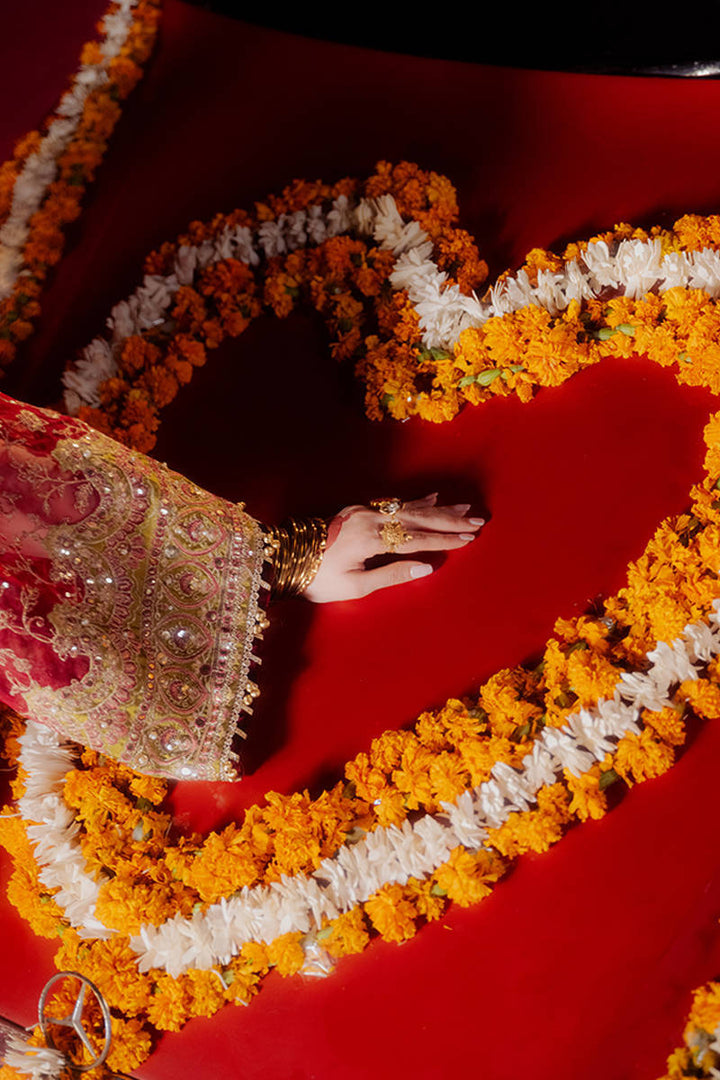 Step into the enchanting world of "Leela" from MNR’s Dur-e-Nayab 2024 unstitched collection. This pomegranate red organza ensemble radiates vibrancy with its intricate thread and tilla embroidery, shimmering sequins, and delicate panni details. Hand-applied pearls add a luminous touch, making each movement dazzle. The organza gharara pants feature a silver-gold foil print and detailed hem, perfectly complementing the rich red hue. Paired with a matching organza dupatta adorned with embroidery and a four-sided border, "Leela" is a true celebration of elegance.